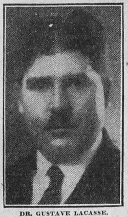 He was born in Sainte-Élisabeth-de-Joliette, Quebec, the son of François-Xavier-Onésime Lacasse and Annie Gernon, and was educated at the Petit Séminaire de Montréal and the Université Laval. He interned in medicine at Windsor and set up practice in Tecumseh. Lacasse spoke out strongly against Regulation 17, which limited Francophone education in Ontario.[2] He became known as "the lion of the peninsula" for his spirited opposition to this legislation.[3] Lacasse served on the town council of Tecumseh and was mayor from 1927 to 1928. He was married twice: to Marie-Anne Saint-Pierre in 1915 and to Marie Rose Lucienne Sasseville-Guilmant in 1948. Lacasse was founder and editor of three weekly journals: La Défense, La Presse-Frontière and La Feuille d'Érable. In 1952, he founded Imprimerie Lacasse at Tecumseh.[2] Lacasse was named to the Canadian senate at the age of 37 and died in office 25 years later.[1]