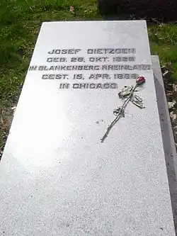Dietzgen died at home smoking a cigar. He had taken a stroll in Lincoln Park, and was having a political discussion in a "vivacious and excited" manner about the "imminent collapse of capitalist production". He stopped in mid-sentence with his hand in the air – dead of paralysis of the heart. He is currently buried at the Waldheim Cemetery[10] (now Forest Home Cemetery), in Forest Park, Chicago, near the graves of those executed after the Haymarket Affair (popularly known as the Haymarket Martyrs).