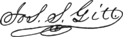 Joseph S Gitt was born on September 9, 1815, the oldest of the eleven children of Daniel (1793-1872) and Lydia Gitt (1797-1886) in Conowago township, Adams County, Pennsylvania. He studied at Gettysburg College (1835–36) receiving a degree of Fellow of Philosophy.[2][3] He married on March 31, 1841, to Miss Anna M Baughman (1817-1898), daughter of David Baughman, of Hanover, Pennsylvania. They had four children, one of whom, Maria Louisa Gitt, married William Gardner Smyser (1845-1926),[4] a civil engineer for the Santa Fe Railway living in Topeka, Kansas.[5]