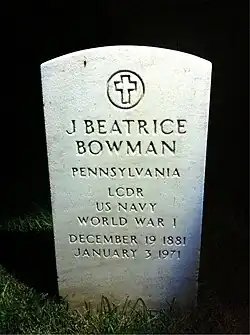 Following her departure from active duty, she made her home in Pennsylvania and stayed active in national and local nursing affairs. When Navy nurses were included in the Navy's ranking system, she received the retirement rank of lieutenant commander in recognition of her service as Nurse Corps' superintendent. Bowman died on 3 January 1971 in Pennsylvania and is buried at Arlington National Cemetery.[1]