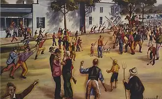 The next day, March 11, word of Glover's arrest and the injuries he had sustained spread in Racine. Charles Clement, editor of the Racine Daily News Advocate, spread handbills about Glover's arrest, and contacted other abolition newspapers which also published accounts of the arrest.[8] Residents gathered in the town square, and local abolitionists mobilized popular support and contacted newspapers.[1] These efforts were facilitated by Sherman Booth, the editor of the Wisconsin Free Democrat newspaper and a prominent abolitionist.[1] To ensure Glover was fairly tried, the abolitionists sent a delegation of over one hundred representatives by boat to Milwaukee. They arrived that same day and joined a crowd that had gathered outside the courthouse demanding a fair and expedited trial.[7] By the evening, the crowd is reported to have grown to about 5000 people (though historians estimate there were around 500).[9]^ With their demands unmet, Booth is said to have spurred the crowd to take matters into their own hands. Using pickaxes from a nearby construction site, and as pieces of lumber as a makeshift battering ram, the crowd broke through the jail walls, freeing Glover.[7] He was escorted to a wagon and helped to escape town quickly. Garland's posse pursued Glover across Wisconsin for weeks.[7]