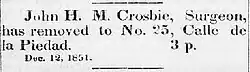 Its tenants also include Scottish Doctor John Herries Maxwell Crosbie, who had his office on Calle de la Piedad No. 25. This doctor who served attending to the wounded of the Battle of Caseros, had been hired by the government of Juan Manuel de Rosas in 1849.[28]