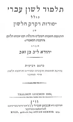 Ben-Ze'ev is considered the first to systematize, in the Hebrew language itself, Hebrew grammar, to arrange it methodically and to introduce logic, syntax, and prosody as part of grammatical studies.[13] His grammar Talmud lashon ʻIvri served as the main source for the study of Hebrew in Eastern Europe for a hundred years.[9] The work is divided into five parts, each prefaced with a poem in praise of the Hebrew language, and includes a ma'amar on the difference between thought and speech.[14] It was republished with additions, annotations, and commentaries no less than twenty times.[15] Most notable is the Vilna edition of 1874, with the commentary "Yitron le-Adam" by Avraham Ber Lebensohn. The first part of a German revision of his Talmud by Salomon Jacob Cohen appeared in Berlin in 1802, and three parts in Dessau in 1807.[13]