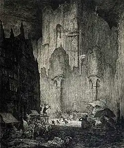 In his large plates from before World War I, such as House of Jan Palfyn, Ghent and Placing the Dragon on the Belfry of Ghent De Bruycker demonstrated the high level of virtuosity he had achieved as an etcher which allowed him to include rich detail and chiaroscuro effects. These works resemble the etchings of the Anglo-Welsh artist Frank Brangwyn, who assisted De Bruycker during the years of his exile in London. Although he produced some city views of London during the war, he mainly worked on large prints, which decried the violence and death that the war had brought to his country. The visual language of these prints drew from the Flemish traditions of Brueghel and Bosch as well as the story of Ulenspiegel. Flemish artists of De Bruycker's generation had rediscovered the art of the Flemish primitives through the exhibition 'Les Primitifs Flamands' ('The Flemish Primitives') held in Bruges in 1902. Each artist had reacted to this rediscovery in a personal way.[3] Ensor's influence can also be seen in a few of De Bruycker's war prints. The preliminary studies for these etchings demonstrate De Bruycker's talents as a draughtsman.[2] During his stay in London, De Bruycker met other artists such as Walter Sickert and got to know the work of James Whistler which influenced his work.