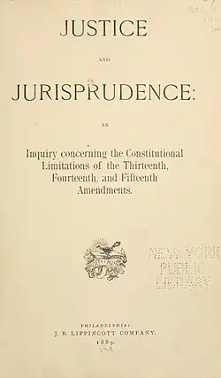Justice and Jurisprudence is a book that was first published in 1889 by the Brotherhood of Liberty. It was a critique of rulings of the Supreme Court of the United States on the Reconstruction Amendments. The book is "the first known comprehensive book on jurisprudence written by blacks"[1] and serves as a valuable source of information on African Americans' legal opinions in the late 19th century.