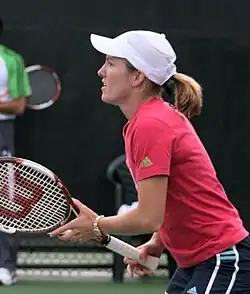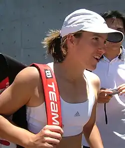 Justine Henin CMW (French pronunciation: [ʒystin ɛnɛ̃];[3] born 1 June 1982) is a Belgian former professional tennis player. She was ranked as the world No. 1 in women's singles by the Women's Tennis Association (WTA) for 117 weeks, including as the year-end No. 1 in 2003, 2006 and 2007. Henin won 43 WTA Tour-level singles titles, including seven majors (four at the French Open, two at the US Open and one at the Australian Open), as well as an Olympic gold medal at the 2004 Athens Games and two Tour Finals titles. Coming from a country with little success in the sport, Henin (alongside Kim Clijsters) helped establish Belgium as a leading force in women's tennis, leading the country to its first Fed Cup crown in 2001.
