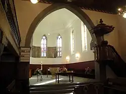 In 1994 it was sold to the community and part of it was converted into an artist's space, art gallery and meeting center, known as the Kulturhof.[4] In December 2011 the municipality voted to create the Schlosszone Köniz, a mixed use zone that includes the church, castle buildings, cemetery and green spaces. The Schlosszone will allow both businesses to develop in the area and help fund the restoration and maintenance of the historic buildings.[5] Today the Swiss Reformed parish of Köniz uses the Commandery church as a parish church. The castle buildings house a restaurant, a music school, the Bern School Museum and the Kulturhof.[6]