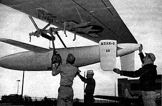 Given the designation KA3N-2,[4] the Gorgon IIIC was limited to a production run of twelve airframes.[5] Redesignated KU3N-2 with the end of the war,[1] six were utilized by the Navy in trials of missile stability, control, and performance;[4] the other six were used by the National Advisory Committee for Aeronautics (NACA) for research into flight conditions at high subsonic speeds, launched from the Pilotless Aircraft Research Station at Wallops Island, Virginia, using a purpose-built 400-foot (120 m) launch ramp.[6] The Gorgon IIIC was redesignated RTV-4, then RTV-N-4, before being retired.[1] Some appear to have been expended as target drones at the end of their life.[7]