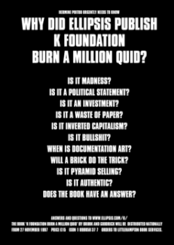 On 27 September 1997, K Foundation Burn A Million Quid (ISBN 0-9541656-5-9, ISBN 1-899858-37-7 paperback) was published. The book, by Chris Brook and Gimpo, contains stills from the film and transcriptions of various Q&A sessions from the tour. It also includes a timeline of K Foundation activity and sundry essays including one from Alan Moore. Publisher Ellipsis promoted the book with an advert modelled on those of the K Foundation – "Why did Ellipsis publish K Foundation Burn A Million Quid?" they asked.[45]