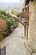 The settlement of Kakopetria is constructed along the valley of the Kargotis and Garillis rivers. The new Kakopetria with its large, modern houses and their tiled roofs, built in the gradient ground and the riverbanks, is located in the eastern part of the valley. The old Kakopetria is built west of the valley and between the two rivers. The roofs of the houses are sloped and tiled and almost all of the houses have an upper floor and a wooden balcony.