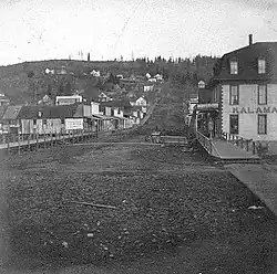 Kalama was entirely a Northern Pacific railroad creation. It was unofficially born in May 1870 when the Northern Pacific railroad turned the first shovel of dirt. Northern Pacific built a dock, a sawmill, a car shop, a roundhouse, a turntable, hotels, a hospital, stores, homes. In just a few months in 1870, the working population skyrocketed to approximately 3,500 and the town had added tents, saloons, a brewery, and a gambling hall. Soon the town had a motto: "Rail Meets Sail". Recruiters went to San Francisco and recruited Chinese labor, who moved to their own Chinatown in a part of Kalama now called China Gardens.[9] The population of Kalama peaked at 5,000 people, but in early 1874, the railroad moved its headquarters to Tacoma, and by 1877, only 700 people remained in Kalama.[8]