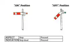 - The horizontal 'ON' position shows the most restrictive indication (requiring the train to stop or slow down or proceed with caution depending on the kind of signal), and