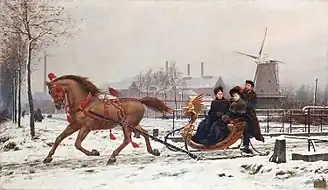 Karel Ooms painted many genre scenes, some of which doubled as family portraits. An example is the Aristocratic family enjoying winter, which was commissioned by the Belgian aristocratic family "Meeùs-Honnorez" in 1885. It shows the three family members riding a horse-drawn sleigh, with the local distillery in the background, which the family owned and which was a major source of the family's wealth. They are in elegant dress and royal poses and bring to mind similar portraits of the Russian Czar Romanov family.[4]