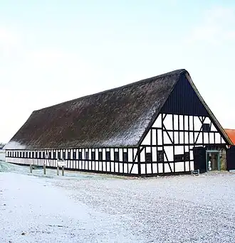 The nearly 300-year-old barn is built in the Holstein style with timbered walls, a wide building, with a pitched and thatched roof. It has been said that the massive inner oak timber might originate from stranded ships in Køge Bay on the east coast of the island Zealand, south of the Danish capital, Copenhagen. Others are of the opinion that the timber might have been reused from a barn that was part of Kalø Castle. A barn supposedly located north of the existing Kalø Caste Ruin on the Kalø peninsula 3 kilometers from Karlsladen. Kalø Castle was abandoned in 1660, but the barn by the castle might still have been there as late as in 1722, five years prior to completion of Karlsladen in the nearby hills.[3]