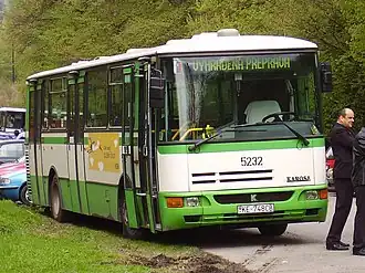 Karosa B 932 is a model of the Karosa 900 series. The B 932 is derived from the Karosa B 732 city bus, and also unified with city bus models such as the B 941 and the B 931. The body is semi-self-supporting with frame and engine with manual gearbox in the rear part. The engine drives only the rear axle. The front axle is independent, rear axle is solid. All axles are mounted on air suspension. On the right side are three doors (first are narrower than middle doors). Inside are used plastic Vogelsitze or Fainsa seats. The driver's cab is separated from the rest of the vehicle by a glazed partition. In the middle part is room for a pram or wheelchair.
