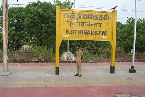 Kathivakkam railway station is one of the railway station of the Chennai Central–Gummidipoondi section of the Chennai Suburban Railway Network. It serves the neighbourhood of Kathivakkam, a suburb of Chennai, and is located 14 km north of Chennai Central railway station. It has an elevation of 9 m above sea level.