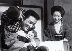The theatrical troupe Kuraku-za (苦楽座; "Pleasure and Pain Company") was formed afterwards,[20] on July 8, 1942 (2 months prior to Sonoi leaving Takarazuka) by Sadao Maruyama and others, namely Tokuemon Takayama (Kenji Susukida), Keita Fujiwara (Kamatari Fujiwara), and Musei Tokugawa.[46] Of the initial run of three plays, Sonoi was cast in Genkanburo ("entryway bath").[34][46] She continued performing for the troupe, appearing in Yume no su ("Dream's nest", 2nd run, June 1943 at the Hōgakuza), Eien no otto ("Eternal husband". 3rd run, January 1944 at the Kokumin Shingekijo[j]).[25][46]