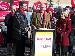 Kevin Taft (born 9 September 1955) is an author, consultant, speaker, and former provincial politician in Alberta, Canada. Prior to his election, he worked in various public policy roles (1973–2000) in the Government of Alberta, private and non-profit sectors, in the areas of health, energy, and economic policy. From 1986 to 1991 he was CEO of the ExTerra Foundation, which conducted paleontological expeditions in China's Gobi Desert, Alberta's badlands, and the Canadian Arctic. He is the author of five books as well as several research studies and articles on political and economic issues in Alberta. In the mid-late 1990s Dr. Taft wrote two books critical of the ruling Progressive Conservatives.[1] The Premier of Alberta at the time (Ralph Klein) insulted Taft in the Alberta Legislature, which solidified Taft's desire to run for office to defend his perspective on public policy. He was an Alberta Liberal member of the Legislative Assembly of Alberta from 2001 to 2012, and Leader of the Official Opposition from 2004 to 2008. Taft is currently an author, speaker, and consultant. He is father to two adult sons and currently resides in Edmonton, Alberta, Canada with his partner Jeanette Boman.