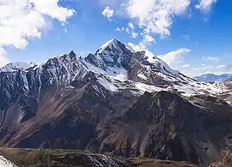 Khatung Kang is a 6,484-metre (21,273-foot) glaciated summit in the Nepalese Himalayas. It is situated seven kilometres (4.3 mi) southeast of Ranipauwa in Gandaki Province. Precipitation runoff from the mountain's south slopes drains into tributaries of the Marshyangdi River and the north slope drains to the Kali Gandaki. Topographic relief is significant as the north slope rises 1,300 metres (4,265 ft) in two kilometres (1.2 mi). The Annapurna Circuit traverses below the north and east slopes of this peak. This peak is on the list of permitted trekking peaks.[4] The first ascent of the summit was made on April 12, 1956, by Arthur Baumgartner, and Marguerite Deriaz.[2][5]