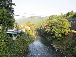 Kibishima river (Japanese:亀尾島川) is a first-class river in the Kiso river system located in central Japan. It flows through Gujo City in Gifu Prefecture. The river originates in the Koshimi Mountains (altitude 1,148m) on the border between Gifu and Fukui Prefecture, flows southeast into Hachiman-cho, Gujo City, joins the Nabi River from the right bank, and then changes its flow to the east-southeast. The catchment area is 120.4 km2 and has a river length of 24.1 km up to the Nagara River. [1]