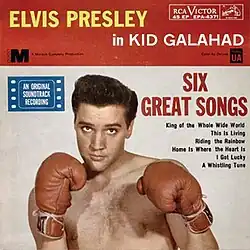 Kid Galahad is an EP by American singer Elvis Presley, containing six songs from the motion picture of the same name.[4] Six songs were recorded for the film and the soundtrack was issued as an extended play record in August 1962 to coincide with the film's premiere. The extended play record was certified Gold by the Recording Industry Association of America on March 27, 1992, for the sales of 250,000 copies.[5] The featured song from the album, "King of the Whole Wide World", received Top 40 radio airplay and reached No. 30 on the Billboard Hot 100 singles chart. The extended play record was the number-one EP in the UK for 17 weeks.[6]