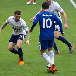 Trippier made his first start in the 2018–19 season in the game against Fulham, and scored his first goal of the season from a free kick.[52] However, it was generally considered that he had a disappointing season, after suffering from a series of minor injuries,[53][54] as well as having committed a number of defensive errors.[55][56][57] In a match against rivals Chelsea, he scored an own goal, in an attempt to pass the ball to goalkeeper Hugo Lloris. His goal made the scoreline 2–0 to Chelsea, which was also the final result of the game.[58][59] Trippier was part of the Tottenham squad that reached the 2019 UEFA Champions League final.[60] He started for Tottenham in the final, as Spurs lost 2–0 to Liverpool.[60] He left Tottenham at the end of the season, having made 114 appearances for the club in all competitions.[61]