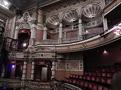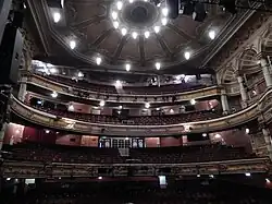The auditorium seats 1,785. The ceiling panelling fans out from a single centre ceiling rose - each panel originally contained painted scenes, although they are currently plain. The proscenium is surrounded by heavy marble and plasterwork borders. Above the proscenium an elegant design with cherubs flanking a crown and a K/T emblem provides a focal point to the theatre when the curtain is down. The red curtain has simple gilding, but often remains unseen as it is unused for many of today's productions. The seats and drapes are of a rich red material. The safety curtain features a painted design of drapes, and framed in the centre is a projection screen. At Grand Circle level two boxes on either side of the auditorium continue where the grand circle balcony finishes. A further box (now disused) is located at Upper Circle level above this, with an elaborate domed canopy. Three domed alcoves sit along either side of the upper circle. Comedian and actor Billy Connolly famously described it as "like performing inside a wedding cake".[9]
