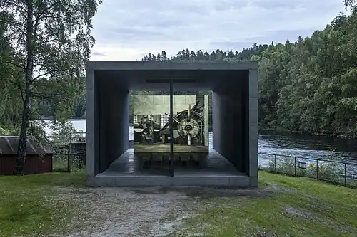 In the early 1880s, a business entrepreneur, Anders Sveaas (1840-1917) acquired the rights to the Kistefossen waterfall in Jevnaker and to build around the surrounding land.[3] At the time, literacy in Norway flourished, leading to the rise in demand for wood pulp for newspapers and books. Having set up a wood pulp mill before, Anders Sveaas saw the opportunity to build another pulp mill on the land. He planned to use the forest for timber, the waterfall as a source of power, and the Randselva river as a mean to transport materials at low costs.[3] Founding the company Kistefos, he soon began the construction of a wood pulp mill, A/S Kistefos Træsliberi in 1889. Following a year of construction, operations at the mill began in 1890 and lasted until 1955, where production ceased.[3] However, all operating materials and machines were still intact, becoming the only pulp mill left in Norway to have survived.[4] As result of family conflict, Kistefos Træsliberi and its facilities were sold off to a neighbouring company, Viul Pulp Mill in 1983/1984.[3][6] Not long after in 1993, Christen Sveaas, grandson of Anders Sveaas, managed to buy back 85% of the company's shares and now owns the majority of Kistefos Træsliberi, along with a number of other shareholders.[3] Contributing artworks from his personal collection, reconstruction of the site soon began with the purpose of transforming the old pulp mill and the neighbouring land into an industrial museum and contemporary art park respectively. Today, Kistefos integrates the old pulp mill among 12 other old factory buildings[3] as part of the park to maintain an important piece of Norwegian culture. Although part of the site is still dedicated to supplying power to neighbouring regions including the town of Jevnaker.[2]