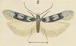 The expansion of the wings is barely 1⁄2 inch. The fore-wings are pale blue with slaty-black markings; a broad oblique band at base ; another oblique band before the middle, containing plical and first discal stigmata ; a third considerably diffused band at 2⁄3, containing a large black discal spot; a longitudinal band along dorsum joining the above described transverse bands ; the outer third of wing, which is pale blue, has a few scattered slaty-black scales, some forming indefinite dots along costa and termen. The hind-wings are very pale greyish-ochceous. All the cilia are greyish-ochreous. The palpi are dull white, with apex of terminal joint blackish. The head is pale greyish-blue, the thorax slaty-black and the abdomen greyish-brown, with apical tuft greyish-ochreous. The legs are greyish-ochreous barred with black.[2]