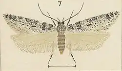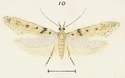The wingspan is 9–11 mm. The forewings are whitish, irrorated with black. The markings are black and ill-defined. There is a small spot on the costa near the base, and a second obliquely beyond it on the fold. A rather oblique streak runs from the costa beyond one-fourth, reaching half across the wing. There are three small discal spots, the first in the middle, the second on the fold obliquely before the first and almost touching the apex of the transverse streak and the third in the disc beyond the middle. The hindwings are pale whitish-grey.[3]