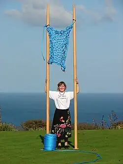 She beats Julia Hopson of Penzance in Cornwall. Julia had knitted a tension square of ten stitches and ten rows in stocking stitch using knitting needles that were 6.5 cm in diameter and 3.5 metres long.[3]