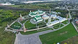 Like some other ancient Russian cities, it has a kremlin, which is a citadel similar to the more famous one in Moscow and also built of red brick.[13] The stone Kolomna Kremlin was built from 1525–1531 under the Russian Tsar Vasily III. The Kolomna citadel was a part of the Great Abatis Border[14] and, although much of the surrounding wall was removed in the eighteenth century and materials used to construct other public buildings, the remaining stretch of wall, several towers, and some interior buildings have been preserved and held in good shape with a museum located inside. In front of the façade stands a statue of Dmitry Donskoy, celebrating the gathering of his troops in Kolomna prior to the Battle of Kulikovo in 1380.
