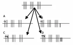 A match consists of at least three games. When beginning a match, the scorer draws the scoring diagram (1st illustration). A team wins a game if all of its lines have been crossed out. By convention the scorer's team is always shown in the lower row. Various factors affect the game score: