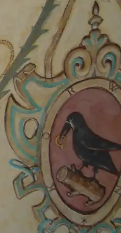 Gules, on a cut off tree stump laid sideways proper, between two upper and two lower knots stands a left facing raven sable, in its beak, a ring or with the diamond facing down. In the crest, above a crowned helmet, there are three ostrich feathers.