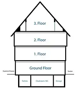 The completed, externally three-story Kunsthaus is based on historic Göttingen half-timbered houses in its closed construction, the building cubature, the gable roof as a roof form, and the floors that project twice toward the top. The linear structure of the horizontal modeling plaster is intended to be reminiscent of "stacked papers".[21]