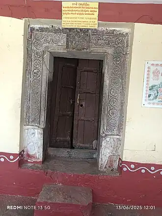Later, a tribal king visited the Swetha Pushkarani and was impressed with it. After learning about the story of its origin from Swetha Chakravarthi, the tribal king constructed a tank around the lake and began worshipping the deity regularly. The tribal king used to stay in Sage Sampangi's monastery, which was situated in the Western side of the temple. Upon the king's request, the deity started facing west.[13] The sage Durvasa visited the temple later with his disciples; the event of his arrival was considered significant. Rama's sons Lava and Kusha were said to have worshipped Vishnu as Kurmanatha in Srikurmam.[14] In Dvapara Yuga, Balarama visited the temple and was denied entry by Bhairava, who was serving as the temple's Kshetrapala (guardian deity). Infuriated, Balarama threw Bhairava away from the temple premises. Kurmanatha learned of this and gave Balarama permission to enter the temple. Balarama, in resentment, cursed that Srikurmam would be the only temple where Vishnu would be worshipped in the form of Kurma Narayana.[13] Legends also say that upon Vishnu's request, Anjaneya agreed to guard the temple.[14]