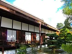 The study hall Ogakumonjo (御学問所) was for reading rites, a monthly poetry recital and also a place the Emperor received nobles. It is a Shoin-zukuri style building with an irimoya hiwadabuki roof.