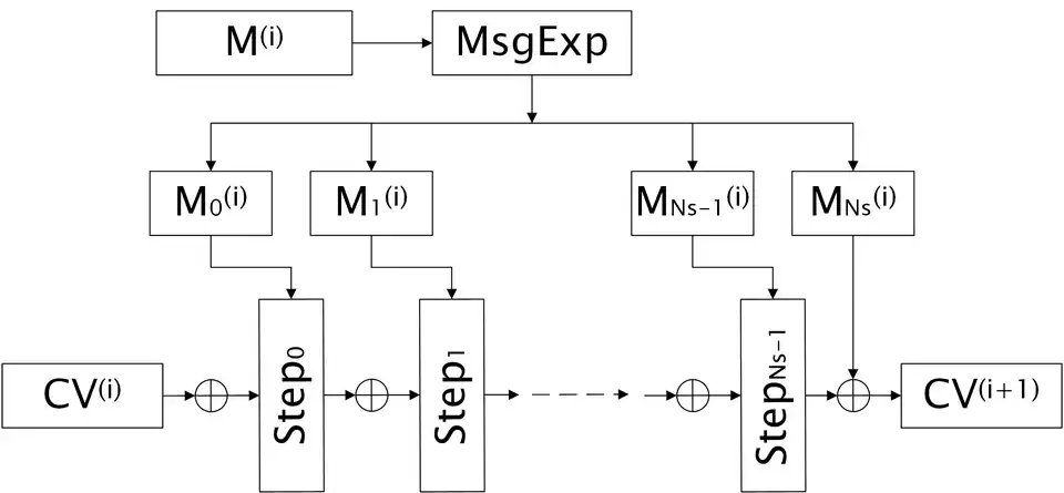 The hash function LSH has the wide-pipe Merkle-Damgård structure with one-zeros padding. The message hashing process of LSH consists of the following three stages.