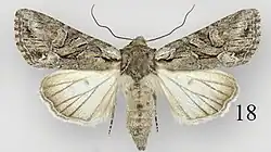 The length of the forewings is 14.2–15.8 mm for males and 13.8–16.9 mm for females. The forewing ground colour is pale grey, with the medial area pale grey brown. The antemedial and postmedial lines are incomplete or absent, when present then best developed toward the anal margin and fading out towards the costa, the antemedial line double, sometimes with slightly paler grey infill. The postmedial line double, often forming pale, indistinct crescent opposite claviform spot. The subterminal area with diffuse dark shading in subapical and anal areas, latter sometimes with a small white crescent. The basal dash is black and crisp and the orbicular spot slightly oblong to slightly kidney shaped, with an incomplete, thin black border and the interior slightly paler than the ground colour. The reniform spot with incomplete thin black border, the interior slightly paler than the ground colour, with indistinct, darker inner ring. The male hindwings are bright, slightly pearlescent white with the terminal third of the veins, and thin diffuse margin fuscous. The female hindwings are duller white overall with more extensive fuscous shading on the veins and marginal area. Adults have been recorded on wing from mid-August to late September.