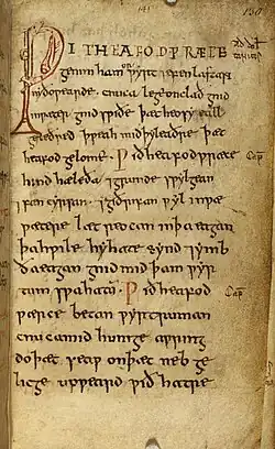 Among the Latin prayers, the longest is a redaction of the Lorica of Laidcenn (formerly often known as the Lorica of Gildas). This seventh-century Irish poem, also preserved in other manuscripts, is a member of the lorica genre of protective prayers. This instance takes the form of an extended litany of body parts for which the speaker seeks the protection of Christ and a multitude of angels from the assaults of demons. It is accompanied in this manuscript by an interlinear gloss in Old English, which probably derives from an exemplar in the Mercian dialect.
