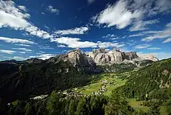 The territory occupies approximately 1,200 square kilometers (460 sq. mi), encompassing five valleys in the Dolomite Alps centred around the Sella massif: