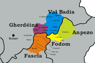 Administratively, Ladinia is divided between two Italian regions, three provinces, and 18 small municipalities: