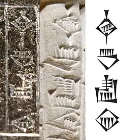 - The name "Lagash" (𒉢𒁓𒆷) in vertical cuneiform of the time of Ur-Nanshe.
