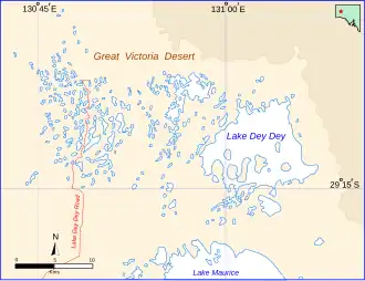 It is normally dry, except during and after periods of heavy rainfall. It is part of the geological basin known as the Officer Basin. The larger Carle Thulka is to the south. Since 1985, Lake Dey Dey is part of the lands belonging to the Maralinga Tjarutja, a southern branch of the Pitjantjatjara.[1][2] The community of Oak Valley is located nearby to the southwest.[1]