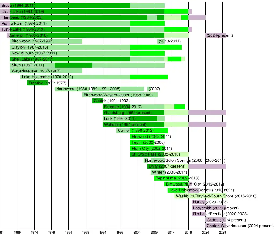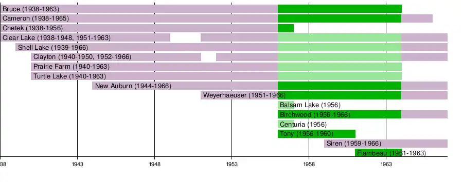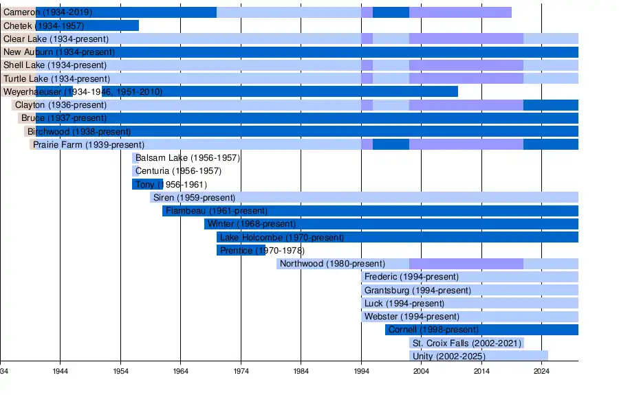 The Lakeland Conference was formed by seven small northwestern Wisconsin high schools in 1934: Cameron, Chetek, Clear Lake, New Auburn, Shell Lake, Turtle Lake, and Weyerhaeuser.[1] Five of the original members of the Lakeland Conference were previously part of the Heart O'North Conference and left that conference due to growing size difference between the larger and smaller schools. All of the conference's original members were located in Barron, Chippewa, Polk, Rusk, and Washburn Counties. By the end of the decade, four new schools were added to the conference: Clayton in 1936,[2] Bruce in 1937,[3] Birchwood in 1938,[4] and Prairie Farm in 1939.[5] The next year, the Lakeland Conference split its eleven-member roster into Eastern and Western Sections:[6]