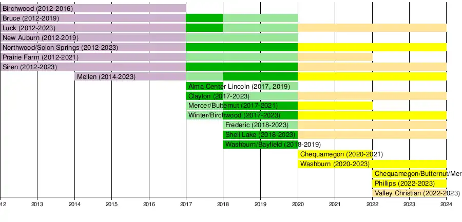 | Chetek-Weyerhaeuser | Chetek, WI | Public | 247 | Bulldogs | 2024 | Dunn-St. Croix | |