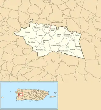 Like all municipalities of Puerto Rico, Las Marías is subdivided into barrios. The municipal buildings, central square and large Catholic church are located near the center of the municipality, in a small barrio referred to as "el pueblo".[7][8][9][10]