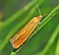Lathronympha strigana is a medium-sized moth with a wingspan of 14–18 mm.[1] The basic color of the wings is light reddish brown.[1] The forewings have a few light lines at the wing tip and two silver cross bars in the outer rear section. Adults are on wing from June to July, sometimes with a second generation in late August or September.[1] The larvae are a little flat, gray green with darker spots and a maroon head. They feed on Hypericum species (St. John's worts).[1]