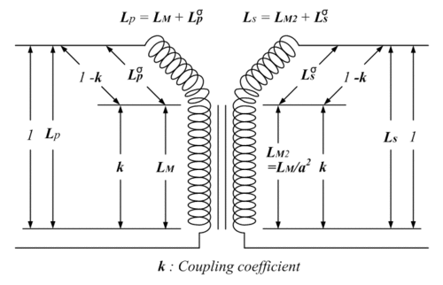 The magnetic circuit's flux that does not interlink both windings is the leakage flux corresponding to primary leakage inductance LPσ and secondary leakage inductance LSσ. Referring to Fig. 1, these leakage inductances are defined in terms of transformer winding open-circuit inductances and associated coupling coefficient or coupling factor .[5][6][7]