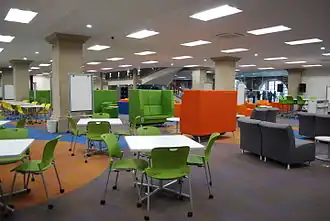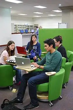 New or renovated library space is now commonly repurposed to bring students together to work, study, and socialize.[46] The learning commons typically offer comfortable furniture for both individual and group study, modular furnishings that allow users to customize the environment to suit their needs, access to wireless networks and electrical outlets,[47] multimedia labs and support, and often a cafe accompanied by relaxed food and drink restrictions.[48] The Learning Commons seeks to expand and integrate the real and virtual choices learners have to share their experiences. Safe, inclusive and welcoming environments throughout a school are imperative to meet the diverse abilities and learning styles of individuals, teams and groups.[49] Virtual learning spaces increase this potential.[50]